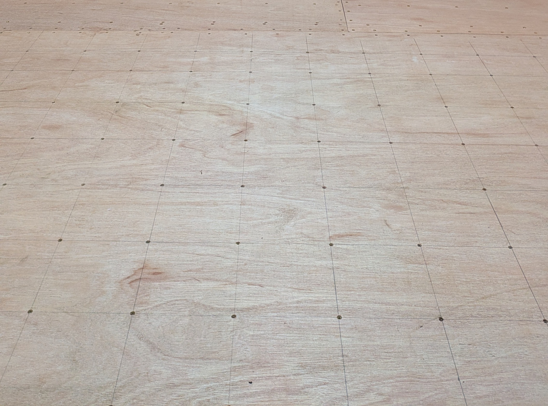 Cross laid a second layer of 9mm SP101 screwed into first at 100mm spacing around the perimeter of each sheet and 150mm spacing internally (almost 1000 18mm wood screws!).