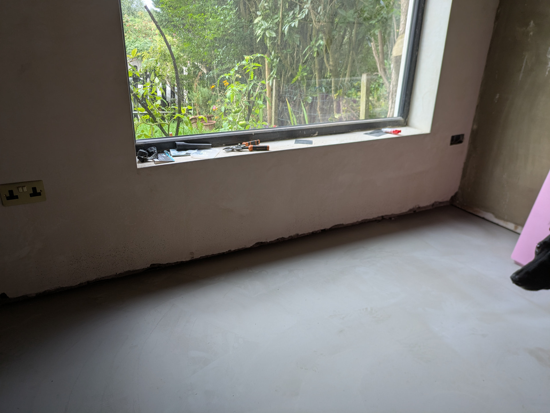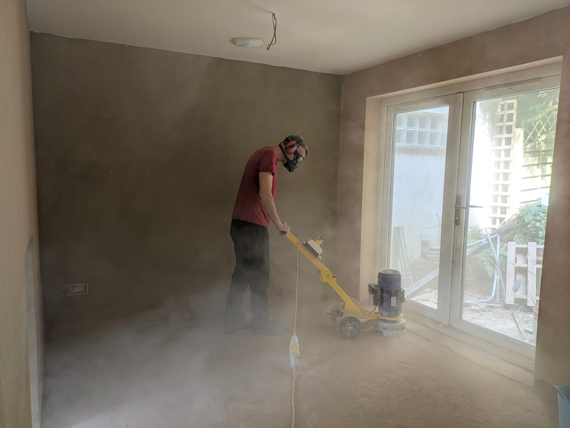 Background - we had a solid floor slab, with no insulation and no functioning DPM, the party wall is built directly on the slab so removal was not an option and we only had 20-30mm beneath the external doors. Original make up was 110mm of concrete with 15mm layer on top which included bitumen in the mix but was in a very poor state.