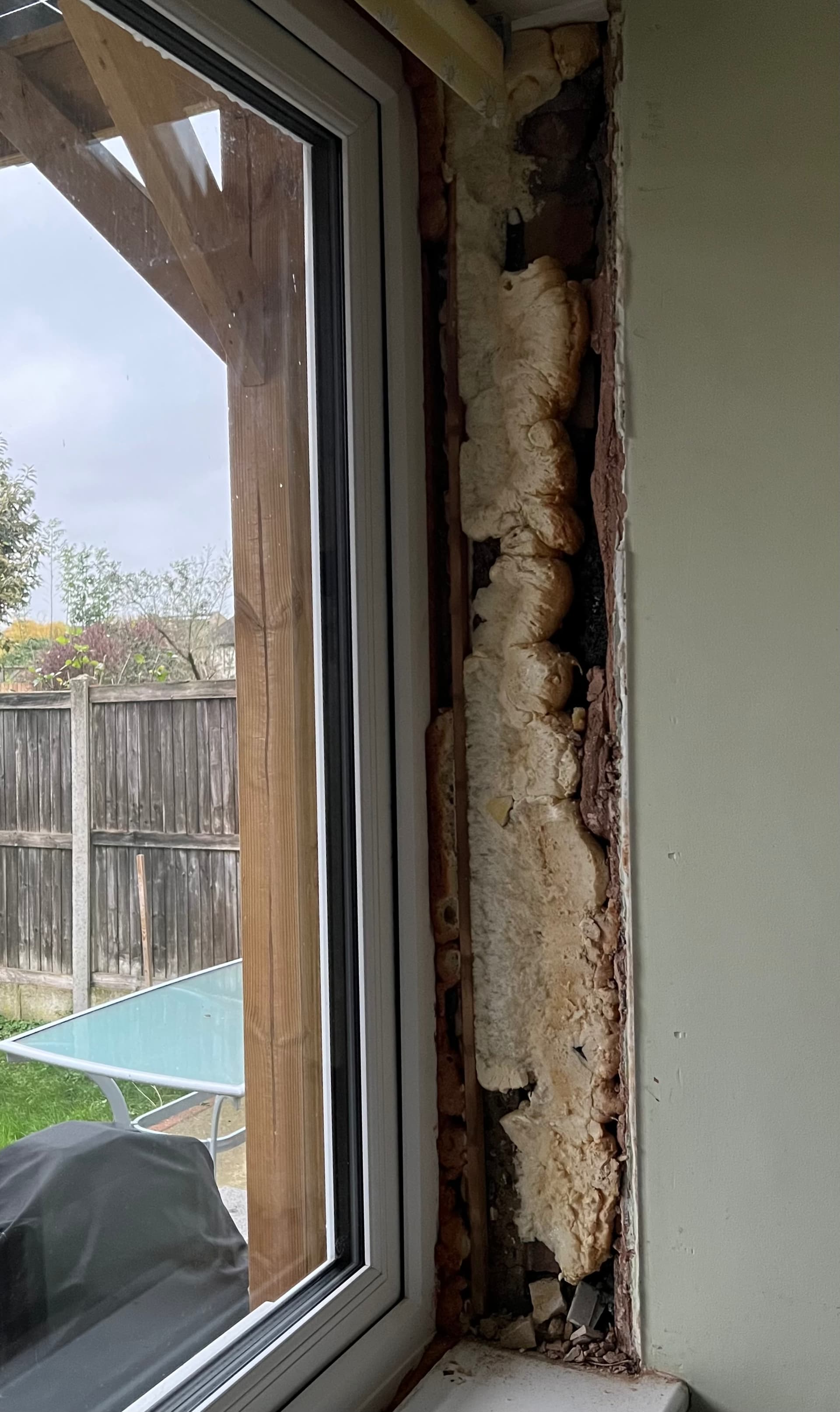 For the time being I’m just insulating the reveals. This gives me a chance to make window to wall joins airtight and at the same time treat the edges of the wall. I am hoping to get EWI and maintain thermal mass. Very important for A2W heat pumps but not for A2A.