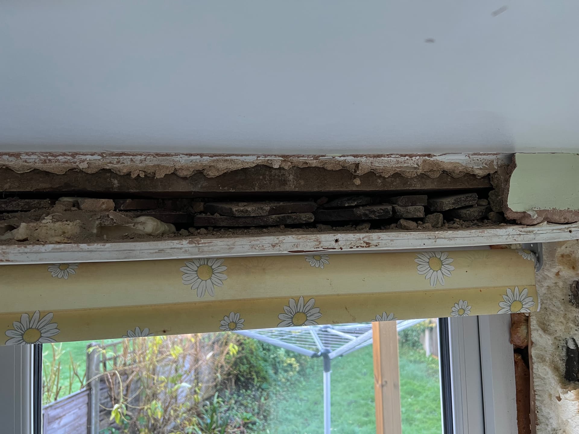 I have been able to excavate a space through to the replacement lintel fitted about 12 years ago. It seems it is only holding up the outer part of the (“solid” masonry) wall and a timber lintel, presumably the original, is holding up the inner part. The concrete lintel is deeper than the timber one. There was a concrete lintel before where the current concrete one is but it exploded due to iron reinforcements rusting and subsequently expanding. The job was done while we were on holiday, so I didn’t see the construction technique, but the replacement was only done from the outside.