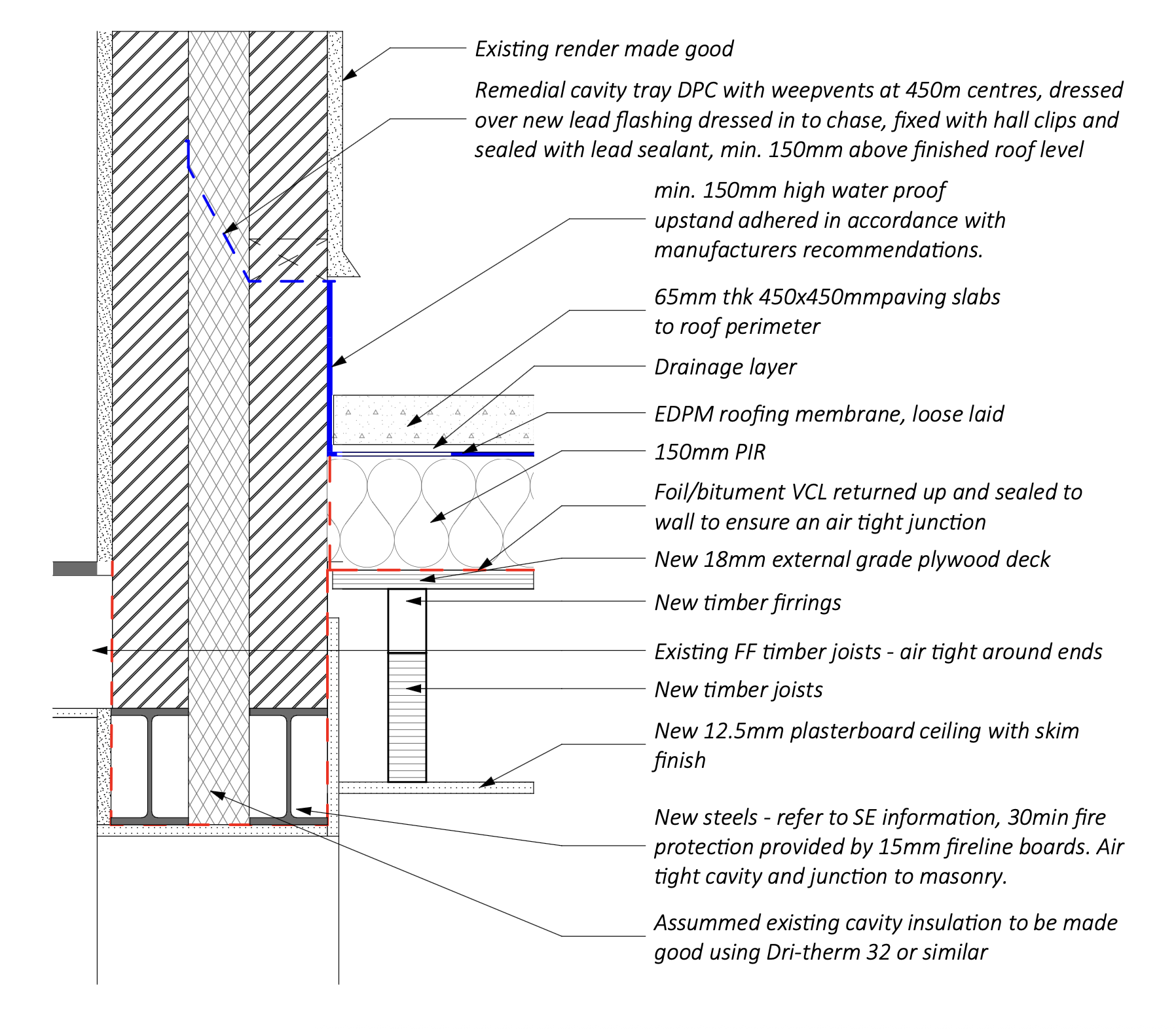 P.S.: It is worth noting that me and my architect didn’t plan for the double RSJ to be changed. This had to be done as we exposed the opening for the roof replacement work. So I went to my structural engineer and got the calculations and the builder was able to fit it quickly…. so I didn’t have time to think this through (maybe isolate the RSJ better) and the architect drawing was actually what the architect thought the opening looked like and so all my architect could do was draw an airtightness layer around the existing structure as I believe this is now standard. In the below detail he then just updated the wording so we could update building control and also to think about this now retrospectively.