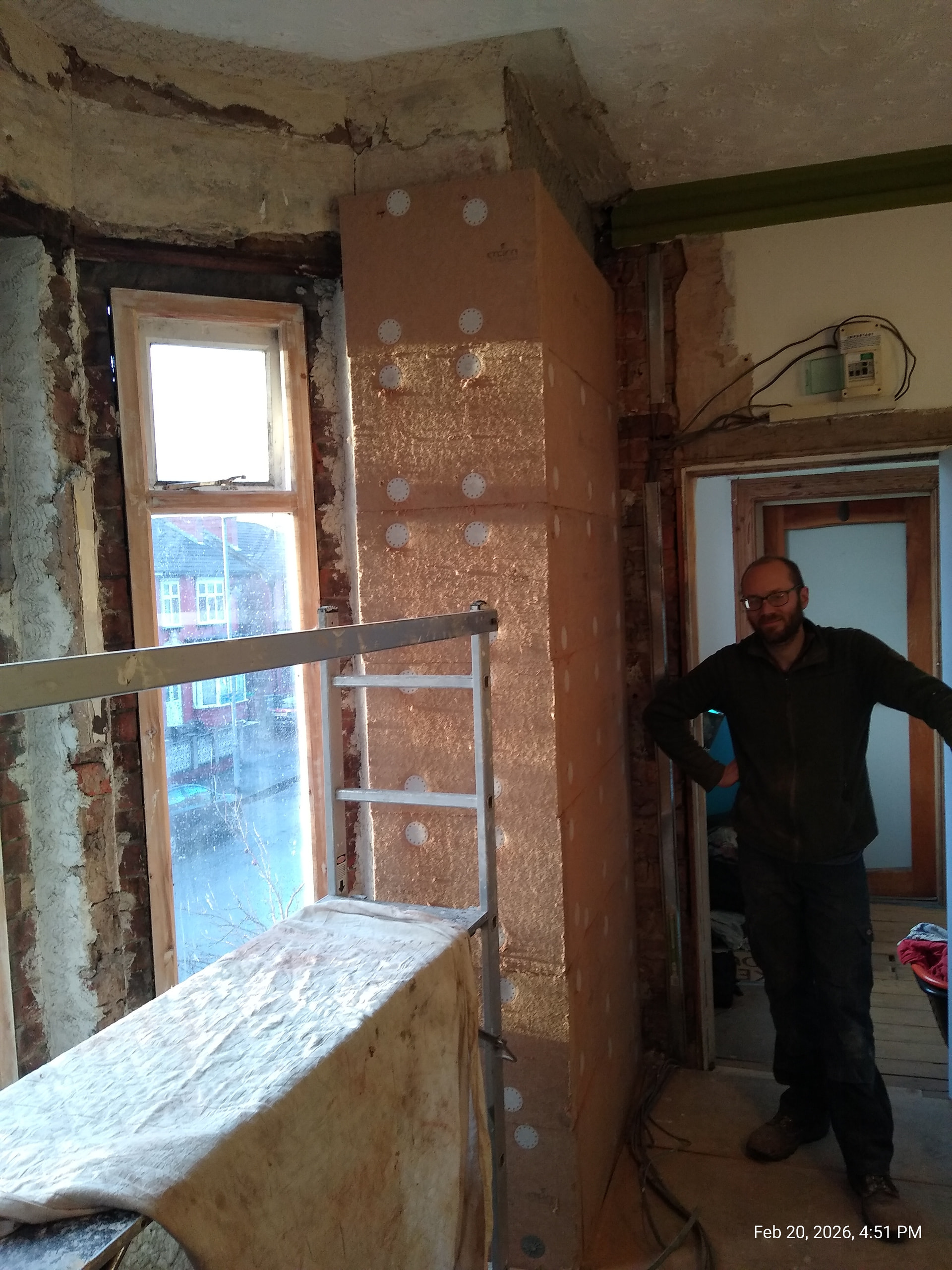 The work I’m doing is actually my partner’s house which is a housing coop. Was an old Victorian farm house so all solid walls. We’re slowly doing a load of energy efficiency improvements and the whole front of the house we plan to do internal wood fibre.